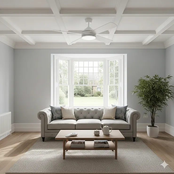 Match fan size to room dimensions using the 107-132cm diameter guidance for typical UK rooms. Undersized fans work harder and use more energy; oversized fans overwhelm smaller spaces.